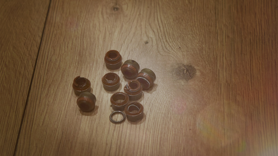 В свободные выходные мы залезли заменить сальники клапанов, т.к. основная проблема была именно в них. Из 12ти маслосъемных колпачков не было ни одного пригодного для работы.