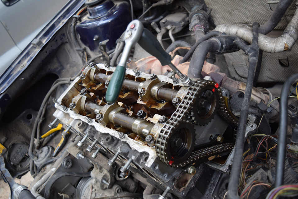 Если вы нормальный человек, то перед снятием следует поставить метки на распредвалах, двухрядной цепи и шкиве коленвала, НООО, учитывая, что я просрал все метки, я не буду зацикливать внимание на этом.