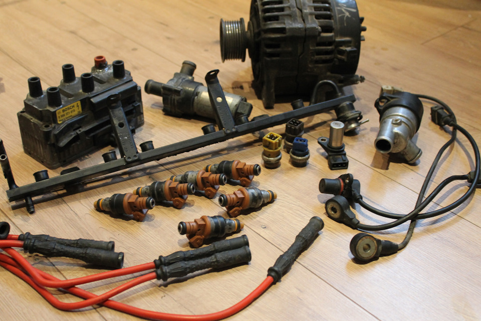 Все детали навесного оборудования работали хорошо, но вид был такой, будто их не трогали с 18го века, поэтому я снял все, кроме насоса ГУРа, чтобы отмыть — Генератор, компрессор кондиционера с трубками, масляный теплообменник, корпус масляного фильтра, модуль термостата, катушку зажигания, доп.электронную помпу, патрубки, масляный щуп и все датчики.