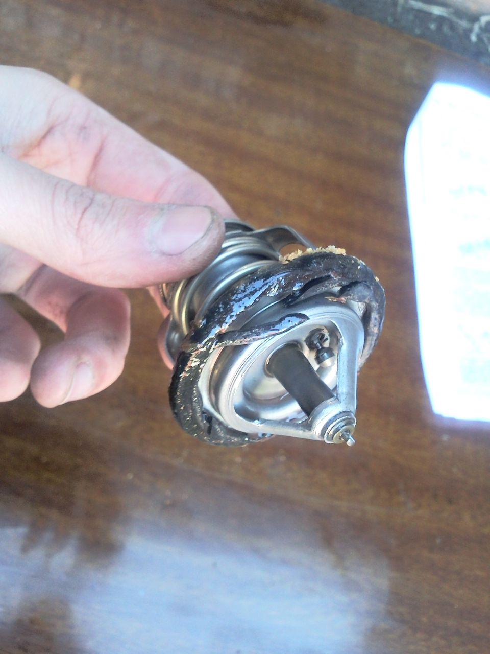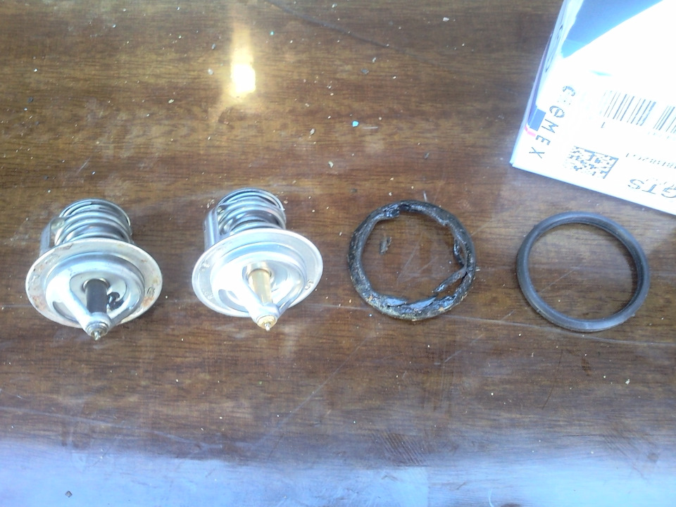 Также поменяли термостат, там ничего сложного нет. Состояние старого вроде рабочее, но лучше заменить, т.к. зимой периодически замечал, что подклинивал в полуоткрытом состоянии и машина дольше прогревалась. Внутри было много грязи, от уплотнительной резинки мало что осталось. Вроде стоял похожий на Tama, что был приобретен, на те же 82 градуса.