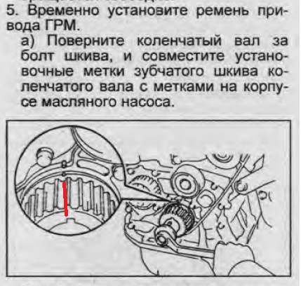 Проблема в том, что со временем эта метка стирается на звездочке об ремень ГРМ и не видна глазом. Необходимо ориентироваться на положение центрирующего выступа и метки маслонасоса относительно друг друга, либо отверткой нащупать неровность на поверхности звездочки.