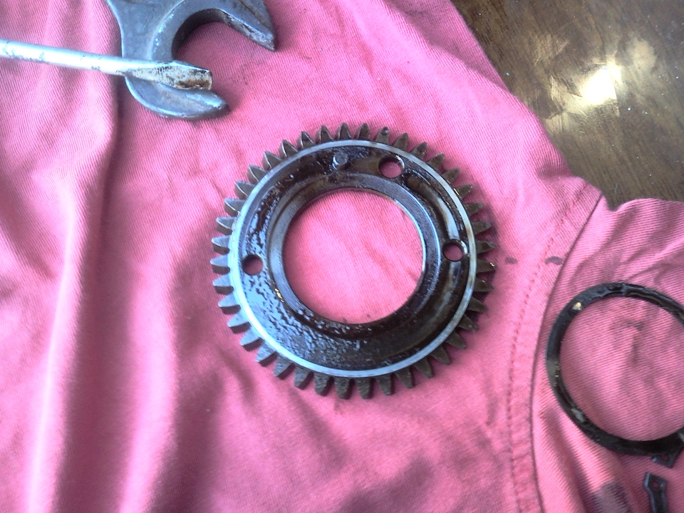 Взводить разрезную шестерню также просто. Один человек держит ключом на 24 вал и оттяггивает отверткой через болт на 6 шестерню, а другой закручивает в отверстие другой болт. Шестерня взводится на 1 зуб.