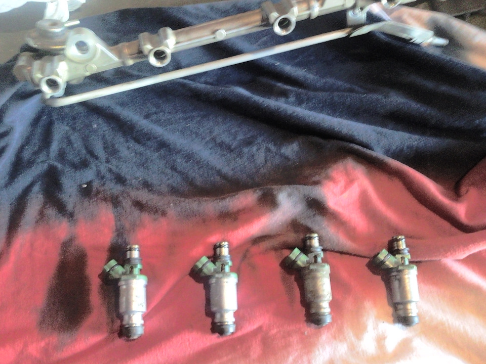 Очистил карбклинером от грязи и поменял резиночки на форсунках. Старые были как пластик и лопались при снятии, за исключением верхних резиновых колечек. При установке рекомендуется проклеить резиновые уплотнители на капельку клея, чтоб не свалились в процессе установки обратно за двигатель)