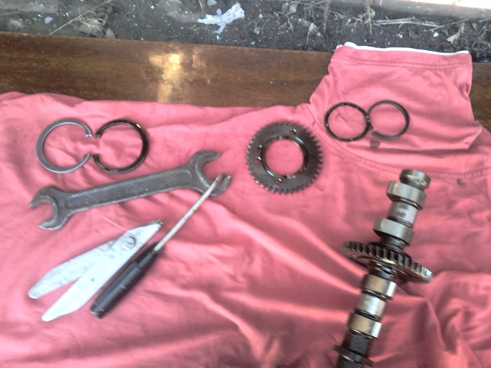 И последнее, что произошло в тот день — это решились на замену разрезной шестерни в выпускном распредвале. Все обзоры интернета пугали, что мол трудно взводить потом и очень все сложно. Ничего подобного, 10 минут и новая пружина на месте взведена. Нужны плоскогубцы на разжатие, ключ на 24 (либо тиски), 2 болта на 6, длинная отвертка. Выкручиваем технологический болт на 6, который удерживал разрезную шестерню взведенной, разжимаем стопорное кольцо плоскогубцами, снимаем пружинную шайбу, разрезную шестерню и саму пружину.
