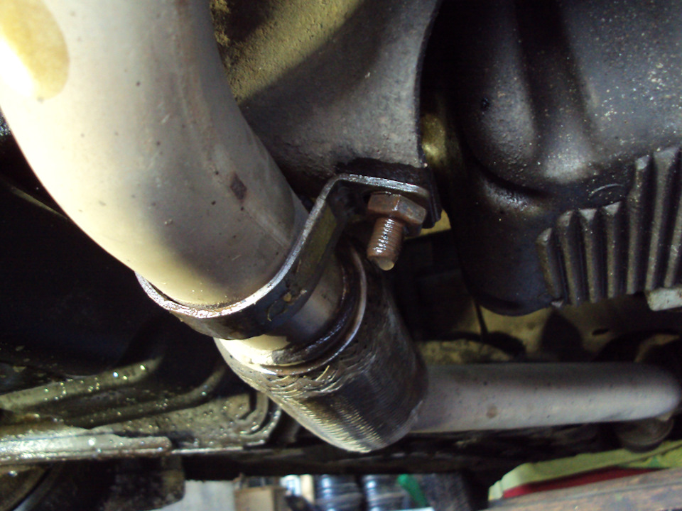 Машина в гараж, выжидаю немного, чтобы чуть остыла и масло стекло в поддон. Далее сливаю старое масло (как раз подошел срок) и снимаю фильтр. Фотки не делал, с этой процедурой многие знакомы и не раз. Начинаю откручивать скобу приемной трубы