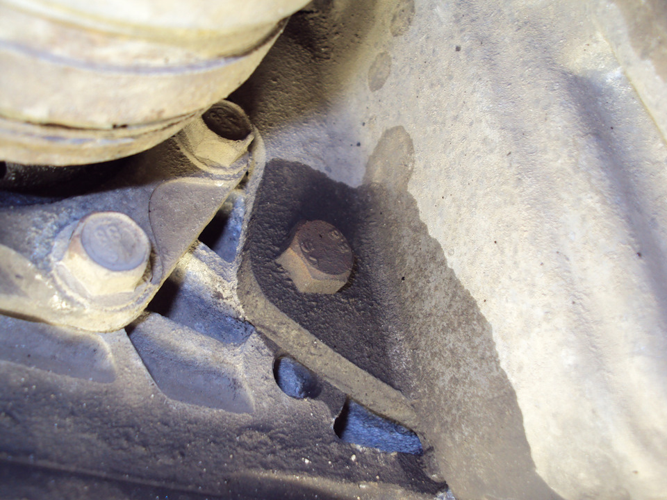 Далее открутил деталь, которая держит скобу приемной трубы. Ключ на 17. Если не снять, то к одному болту поддона не подобраться.