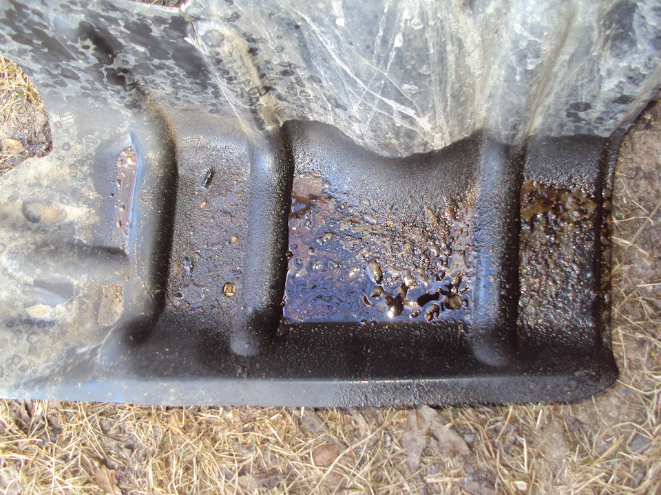 А вот такой поддон я снял. Внизу, как видно, осталось немного масла, хотя сливал я его через пробку. Несливаемый остаток, который потом перемешается с чистым и свежим маслом.